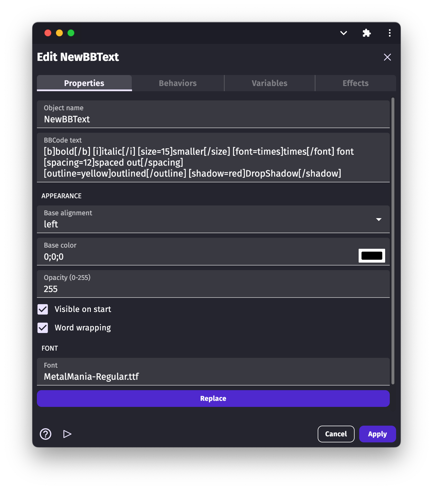BBText object displays rich "multi-style" text on the screen. You can customize style properties (for example, size and color) of different parts of the text by using "BBCode" style tags. You can also modify the BBText object properties during gameplay using events.
