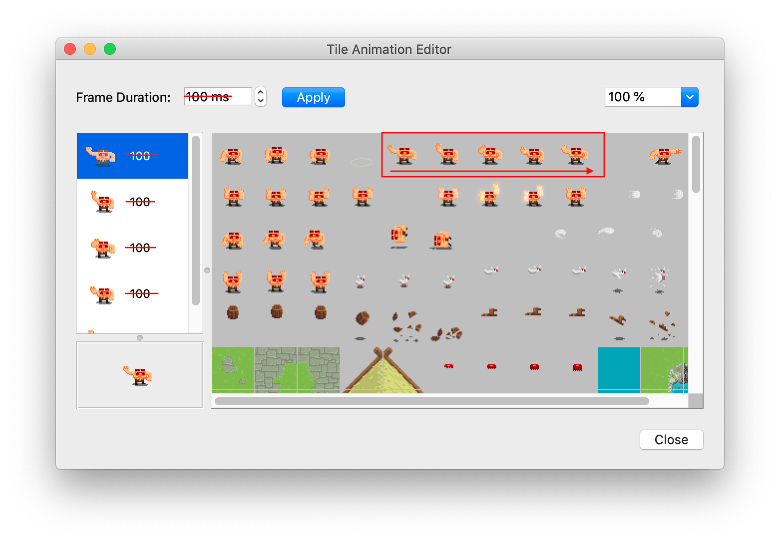 - When you close the layers window, the various tiles from the tilemap will display on the left, and the tilemap can be painted.